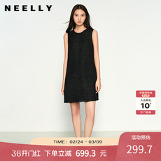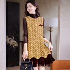 韩国chic秋季复古小香风V领亮片设计宽松休闲粗花呢背心连衣裙女