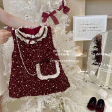 LittleNaive儿童新年连衣裙冬新款生日珠片丝绒裙女童加绒背心裙