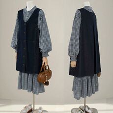韩系超好看格子连衣裙套装女2025秋季减龄牛仔背心裙衬衫裙两件套