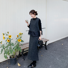 秋冬温柔甜妹U领无袖碎花花苞背心连衣裙+长袖针织打底衫两件套装