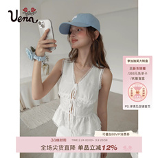 【月见白芷】Uena白色肌理感胸前刺绣绑带背心蕾丝花边半身裙套装