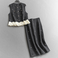 韩系重工钉珠不规则扣针织背心+花苞中裙2026早春新品miu系套装裙