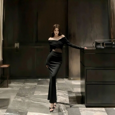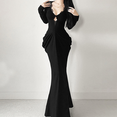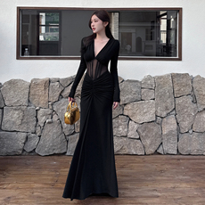 走秀服装哥特风黑色性感v领长袖连衣裙女御姐风收腰气质礼服裙子