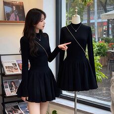 原创秋冬辣妹气质韩系学院长袖百褶小个子收腰针织连衣裙短裙女装