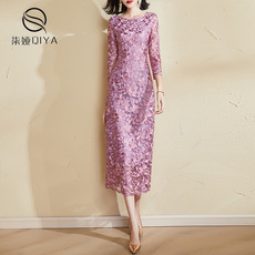 清仓福利质感连衣裙女新款粉紫色绣花长袖气质减龄收腰显瘦裙子