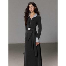 贰羊设计【灰棱】通勤气质撞色polo翻领长袖连衣裙女收腰显瘦长裙