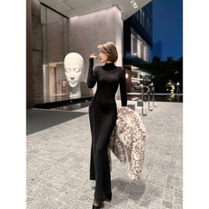XULU原创气质纯色丝绒优雅知性修身显瘦轻奢高弹力长袖高领连衣裙