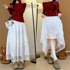 白色蕾丝蛋糕裙女春秋高腰显瘦宽松中长款a字芭蕾风蓬蓬半身裙子
