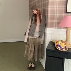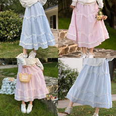森女部落甜美风格子半身裙女新款多层蕾丝拼接设计感大裙摆长裙春
