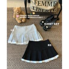 【英伦少女】Uena美式复古学院风格纹拼接蕾丝花边百褶半身裙女