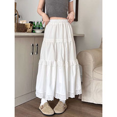 Yukiss 压褶白色长款蛋糕半身裙女夏韩垂感宽松遮肉A字蕾丝仙女裙