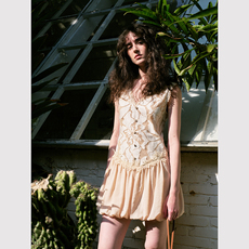 八盖pinky piggy 南法假日 米黄色蕾丝连衣裙女花边收腰系带短裙