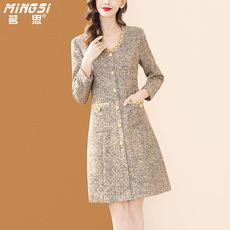 茗思小香风粗花呢连衣裙女秋季2025新款气质钉珠V领收腰显瘦裙子