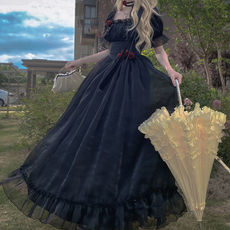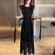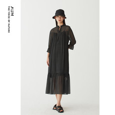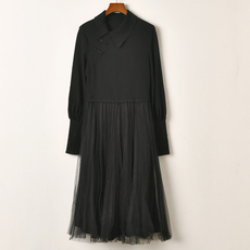 艾诺丝系列盘扣网纱拼接连衣裙女黑色气质修身中长款千金风