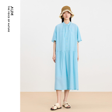 AUM噢姆夏季口袋长裙文艺蓝色小立领棉连衣裙