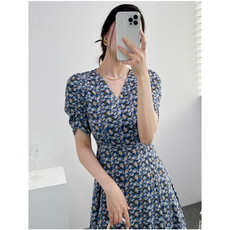 XZCV高级感法式复古V领碎花雪纺连衣裙 2025年夏季新款收腰显瘦