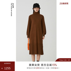 AUM噢姆冬季可机洗羊毛圆领收腰连衣裙黑色休闲长裙