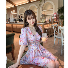 2025夏季新款一片式裹身裙紫色小碎花气质法式V领雪纺a字连衣裙女