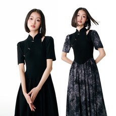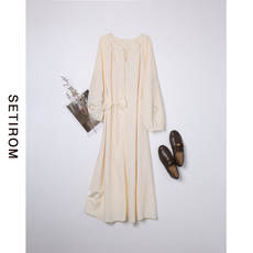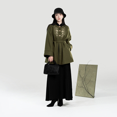 织造司[苔石]新中式圆领对襟大衣立领喇叭长袖连衣裙A字修身长裙