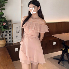 粉色挂脖吊带连衣裙女夏季2023新款甜美高级感露肩无袖千金长裙子