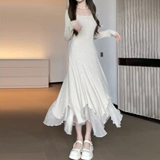 白色高领连衣裙女秋冬款长袖气质荷叶边中长裙收腰褶皱内搭长裙