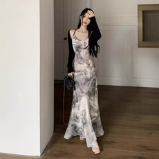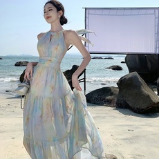 新中式无袖晕染挂脖连衣裙女夏季2024新款慵懒风气质显瘦度假长裙