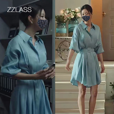 蓝色衬衫裙连衣裙女夏娃明星同款高级感A字裙收腰气质短裙子