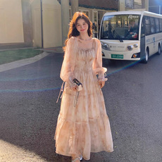 春夏新款绝美长袖雪纺连衣裙仙女超仙森系温柔风茶歇法式初恋裙子