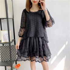 2025春季新款蕾丝刺绣圆领套头假两件七分袖大摆气质减龄连衣裙韩