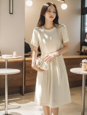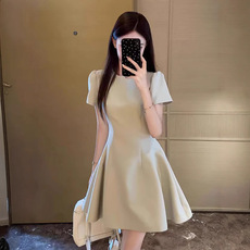 法式甜美圆领露肩短袖连衣裙女2024夏季新款温柔风减龄a字裙子女
