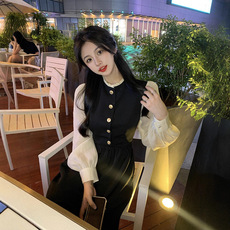 法式黑色半高领长袖连衣裙女蓬蓬裙子高级感a字裙赫本风小黑裙潮
