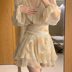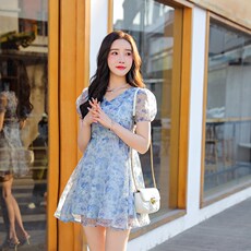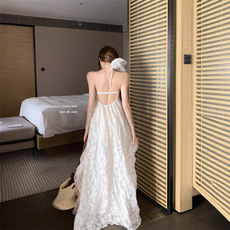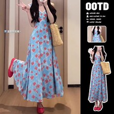速发2025新款蓝度法式v领碎子吊带连衣裙花夏季背心裙海边色假长