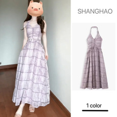 甜辣纯欲紫色夏日绝美显身材连衣裙女收腰包臀吊带裙度假蕾丝长裙