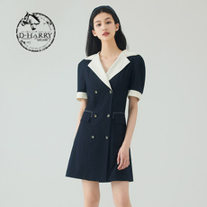 小黑裙连衣裙女简约学院风高腰气质衬衣裙短袖明星同款短裙蓬蓬裙