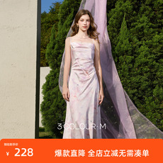 三彩2026春季新款蕾丝一字领缎面吊带裙晕染法式连衣裙长裙浪漫M