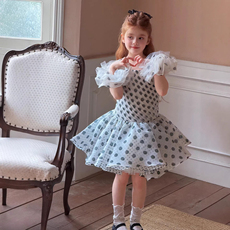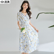 黛玛诗显瘦花裙子2025秋季新款田园风蓝色浪漫网纱印花连衣裙女