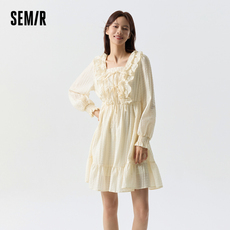 森马连衣裙女荷叶边蝴蝶结浪漫2024春季新款甜美方领肌理裙子温柔