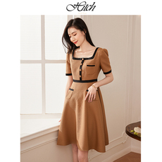 希区瑞普高端别致复古连衣裙夏中长款浪漫法式撞色大方领裙子