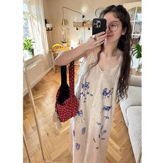法式复古无袖背心连衣裙女温柔别致文艺风苎麻剌绣休闲棉麻长裙子