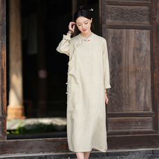 新中式棉麻连衣裙中国风苎麻禅意佛系女装复古斜襟盘扣改良旗袍裙