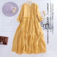 2022春夏旅行文艺纯色棉麻连衣裙女亚麻高端大码气质显瘦收腰长裙