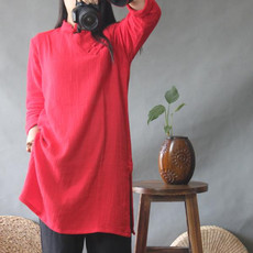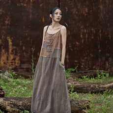 18449改良旗袍裙斜襟盘扣炒色棉麻连衣裙禅意砂洗做旧包边衬衫裙