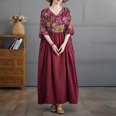 枣红色裙棉麻夏季新款V领拼接复古风连衣裙中老年妈妈装大码长裙