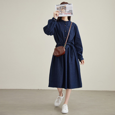 连衣裙秋冬新款法式气质腰带修身开衫厚实棉麻有大码外贸日单女裙