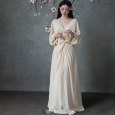 新中式v领气质小个子海边度假棉麻晨袍礼服夏日巨好看长裙连衣裙