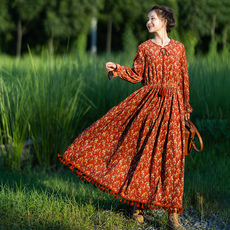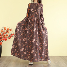 外贸出口长袖大码可穿200斤复古百搭数码印花加厚长裙棉麻连衣裙
