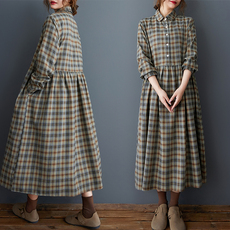 秋装新款女装文艺小清新翻领棉麻格子衬衫裙长袖宽松叠穿连衣裙