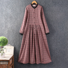 秋装新款女装日系甜美立领千鸟格棉麻长袖连衣裙宽松长裙叠穿