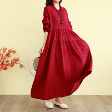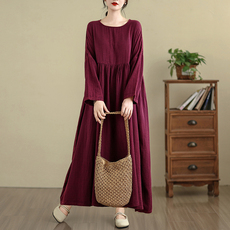 紫红色长袖大码加肥极大复古百搭亲肤棉料加厚长裙棉麻连衣裙纯色