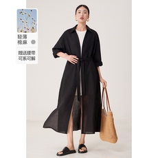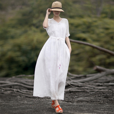 日系高端外贸出口女装复古气质苎麻连衣裙长款绑带收腰大摆长裙子